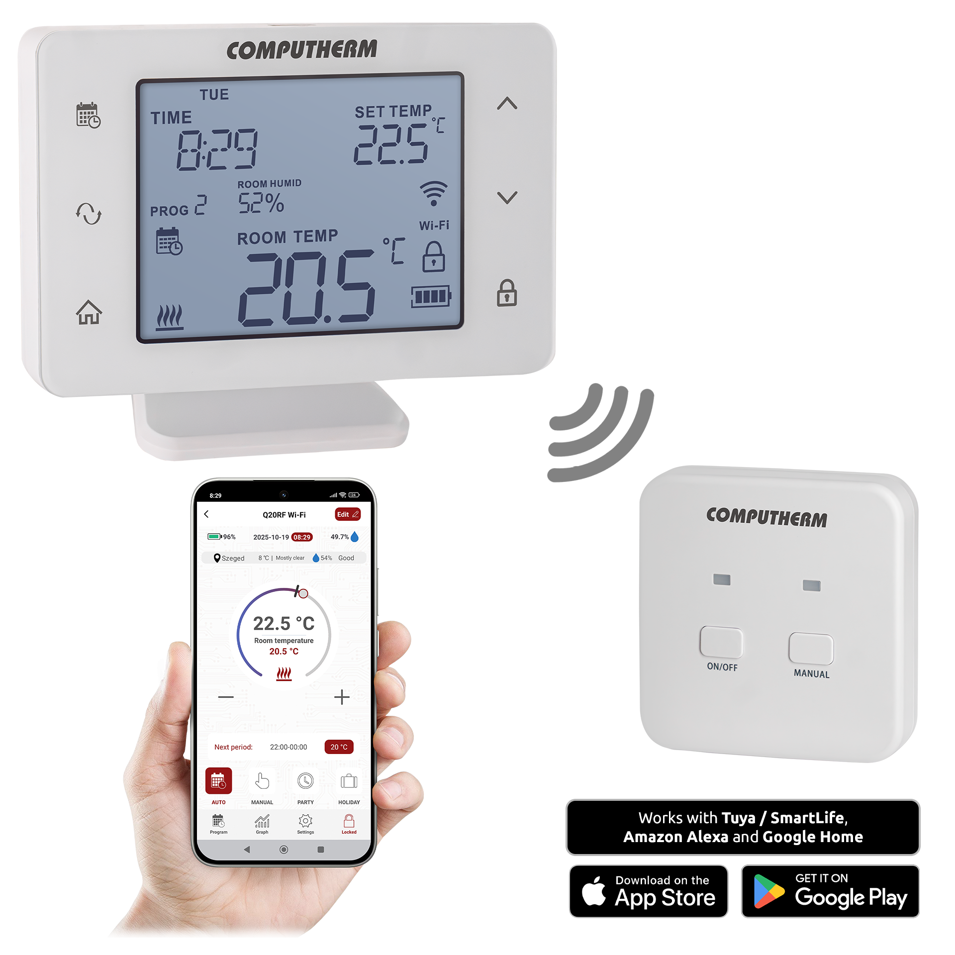 Стаен термостат COMPUTHERM Q20RF Wi-Fi се препоръчва за места, където точното измерване на температурата и влажността и тяхната настройката, точността на превключване, високата функционалност и програмируемият контрол на температурата и влажността са важни. Смарт термостатът може да се управлява както през смартфон или таблет, така и чрез тъч бутоните на дисплея. Работното му състояние може да се следи непрекъснато. Приложението Computherm Smart е преведно и на български език.